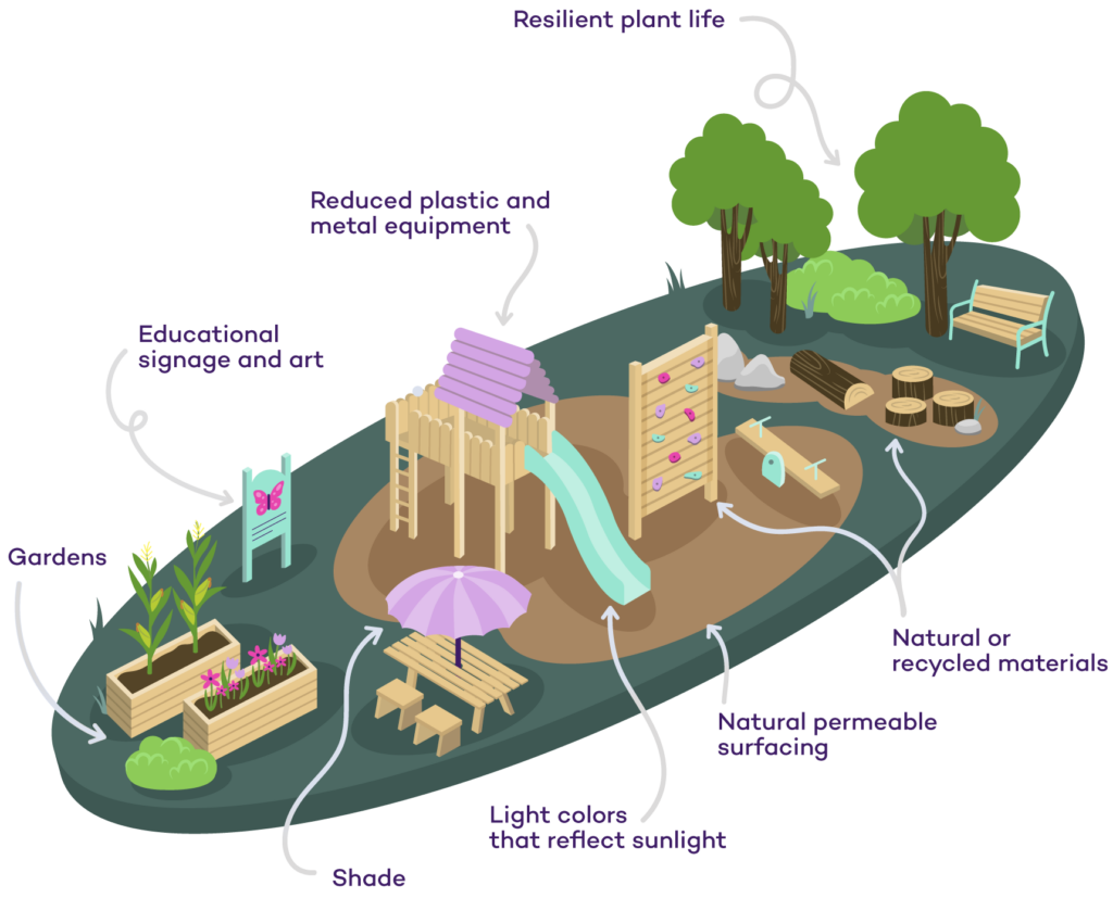 We seek opportunities to support sustainability in our playground projects in many ways, including working with manufacturers and partners who use environmentally sustainable materials, prioritizing minimal waste and addressing extreme heat, and committing to creating playspaces that are built to last for generations to come.